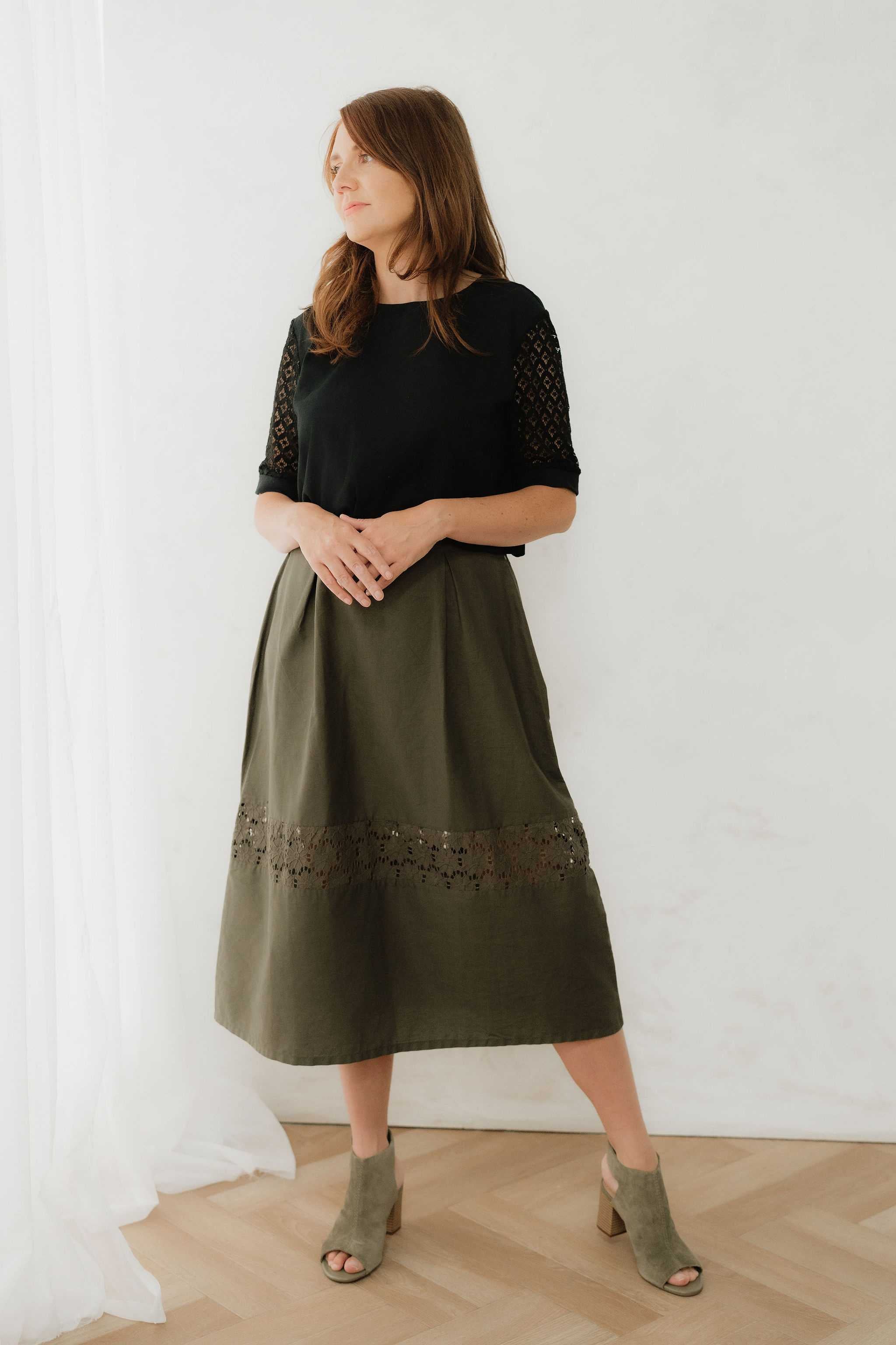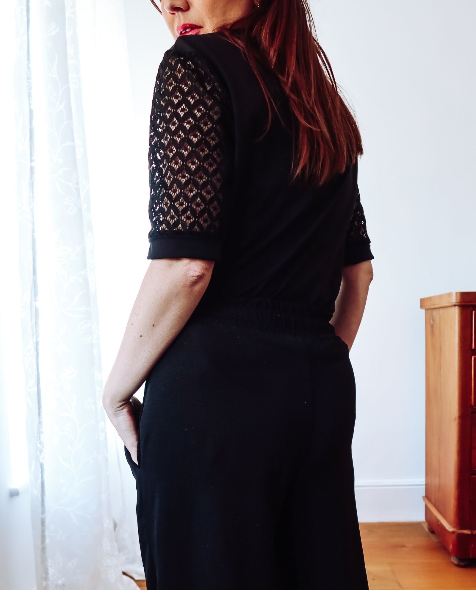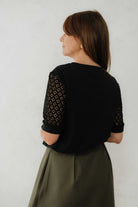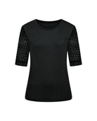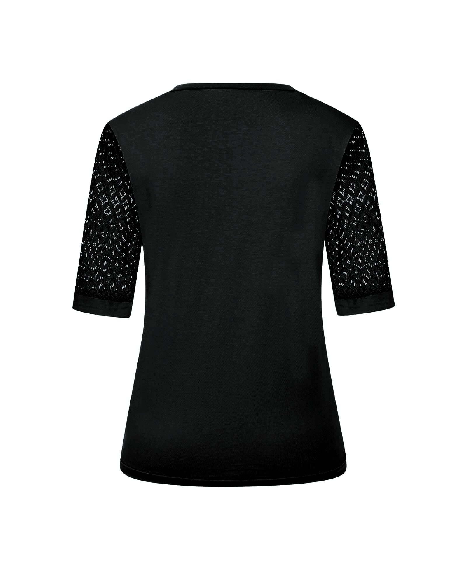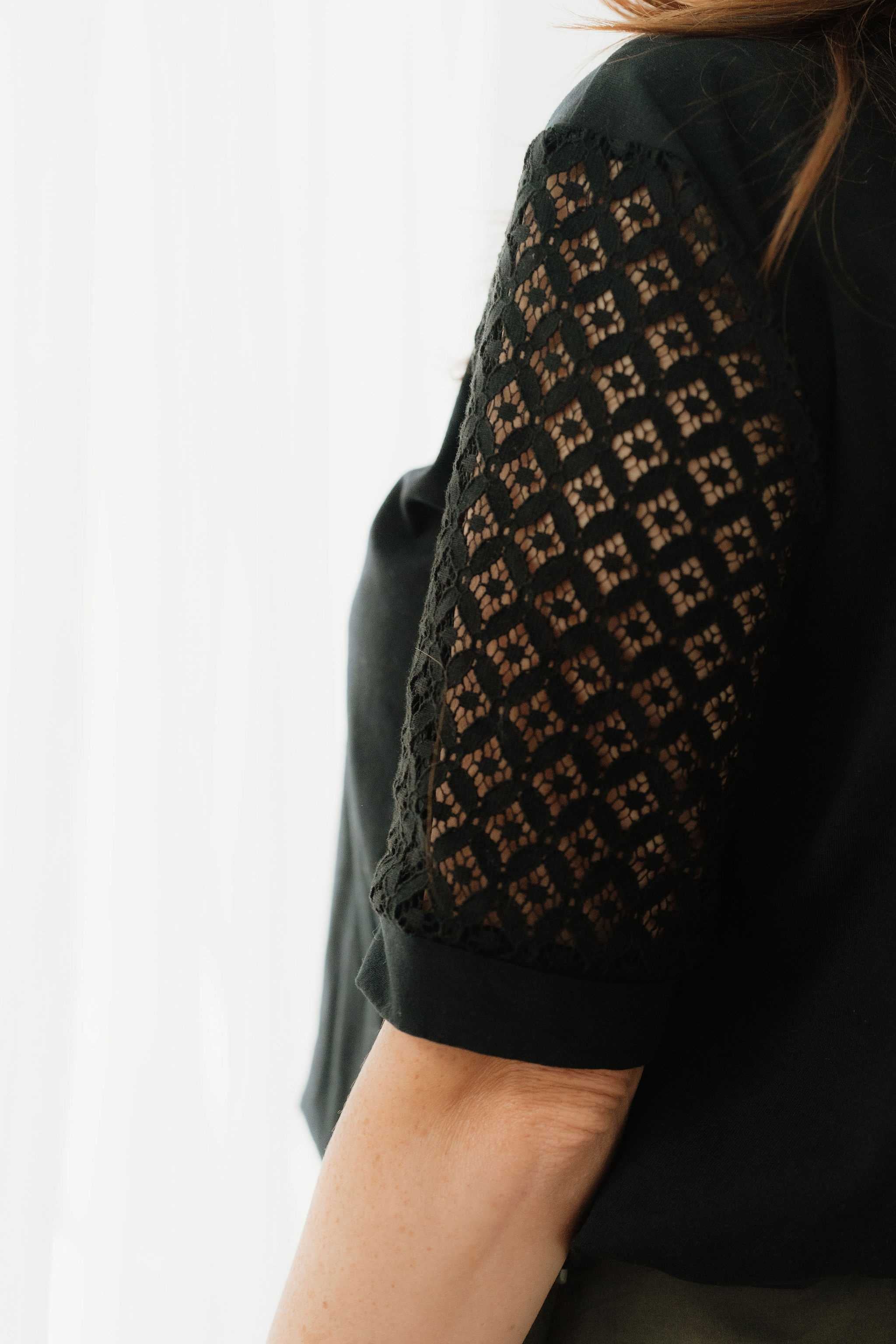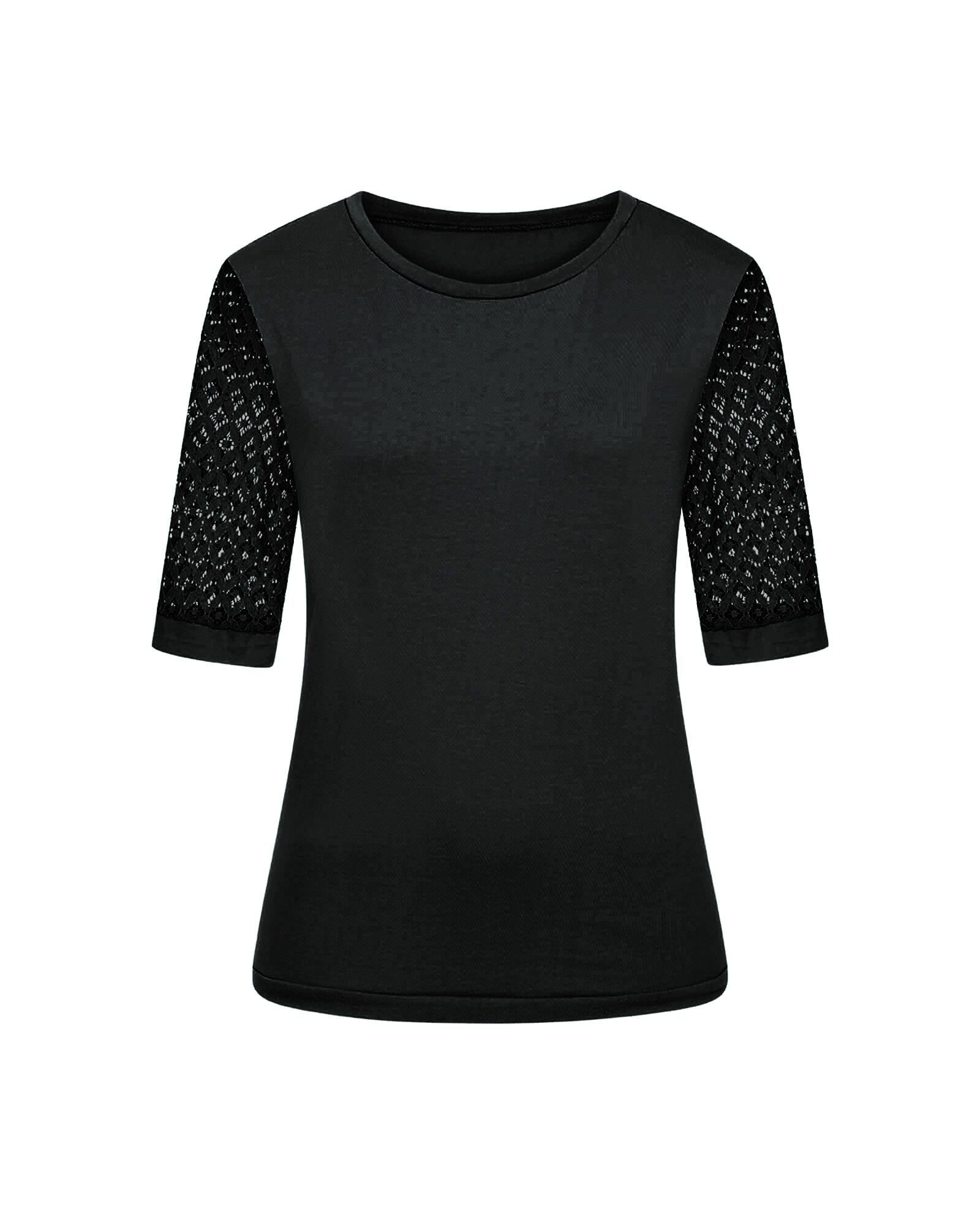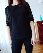 Meet LUCY the ultimate balance of elegance and comfort. This stunning Black Lace Sleeve Cotton T-Shirt is the perfect piece for any wardrobe, offering a chic twist on the classic tee. Crafted from soft, mid-weight cotton jersey in a timeless black shade, it’s ideal for effortless styling. The geometric lace sleeves add a sophisticated, feminine touch, making it a versatile option for both casual and dressy occasions. Whether tucked into high-waisted trousers or worn casually over denim, this slim-fit top effortlessly transitions from day to night.