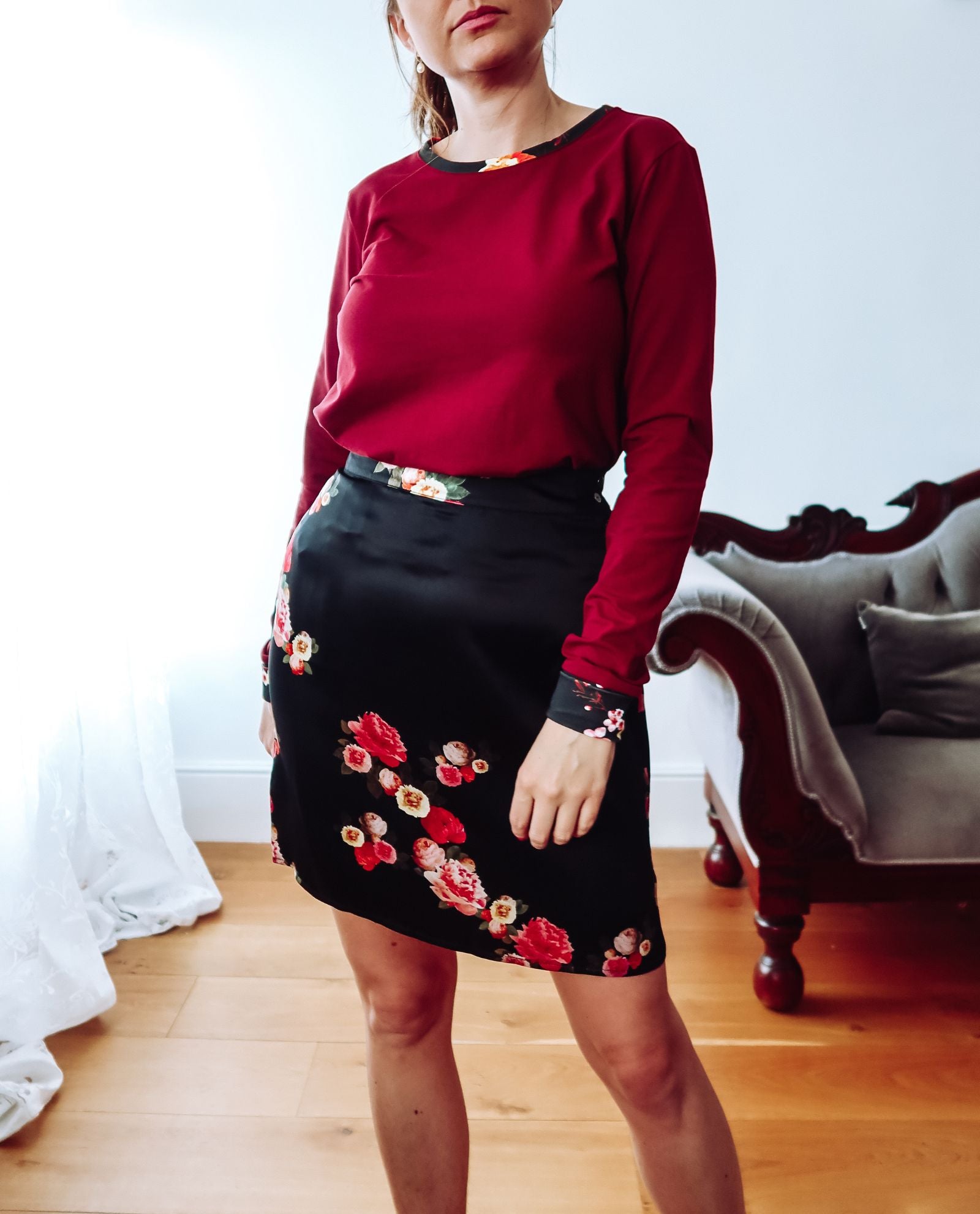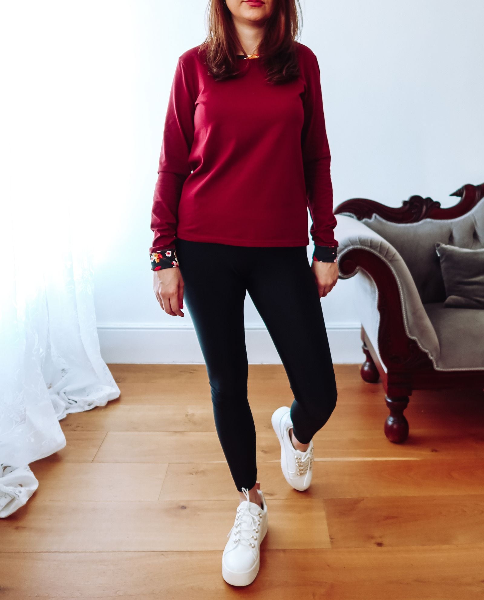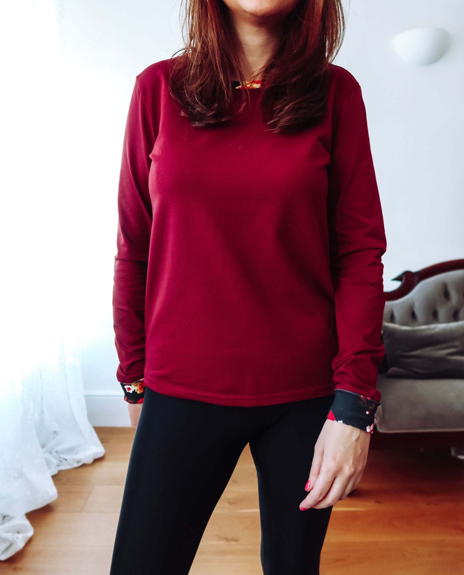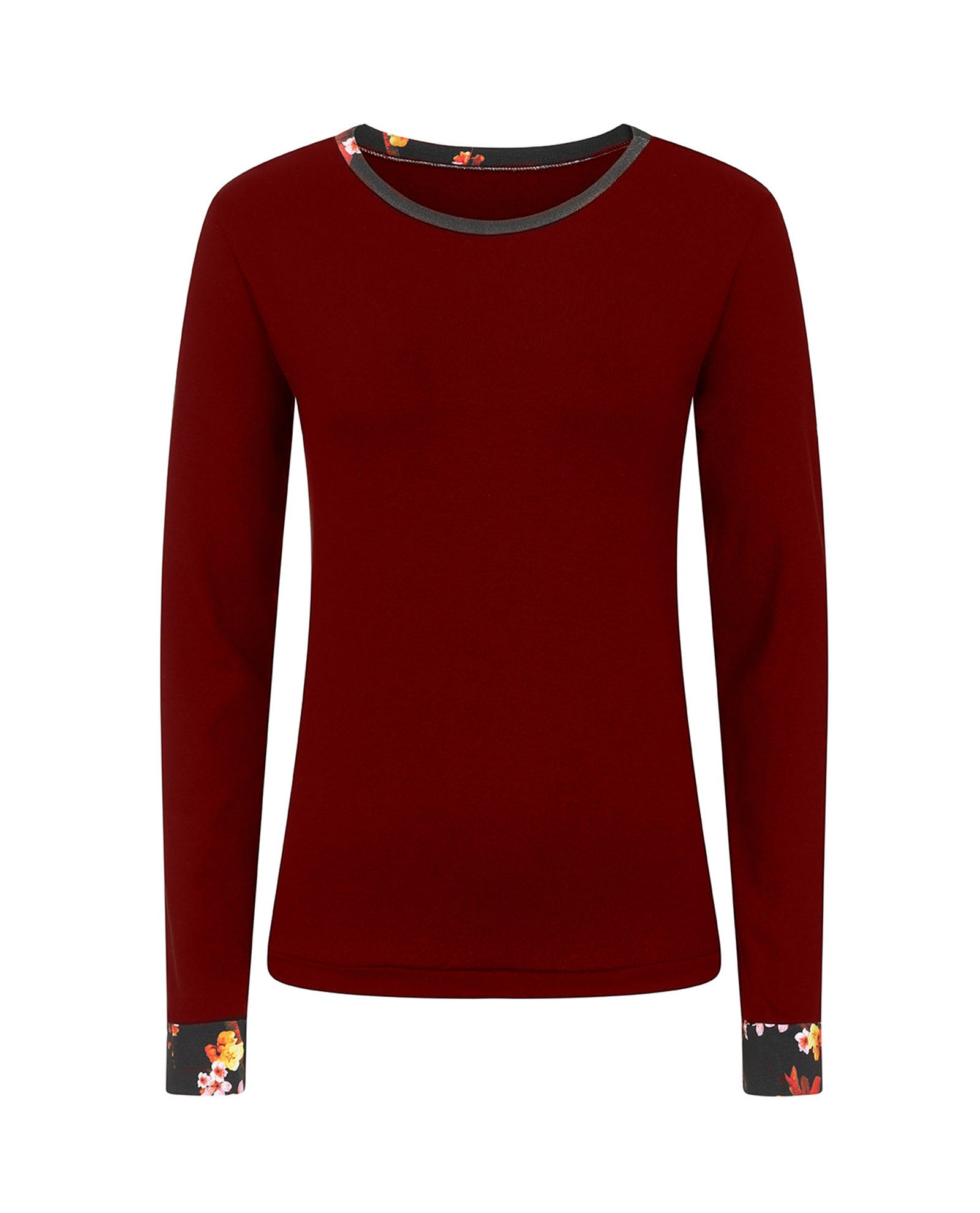 Discover ANNA, our loose-fit Burgundy Cotton Long Sleeve Top - the epitome of comfort and style. Created from a sumptuously soft cotton jersey, this wardrobe essential boasts long sleeves and a bespoke floral print delicately tracing the neckline and sleeve cuffs. The vivid red, orange, and yellow hues of the print bring a playful burst of colour to this everyday favourite. Whether paired with leggings or jeans, ANNA effortlessly creates a casual yet chic ensemble. Ideal for layering with sweatshirts, blazers, or shirts, this versatile top is perfect for year-round wear.