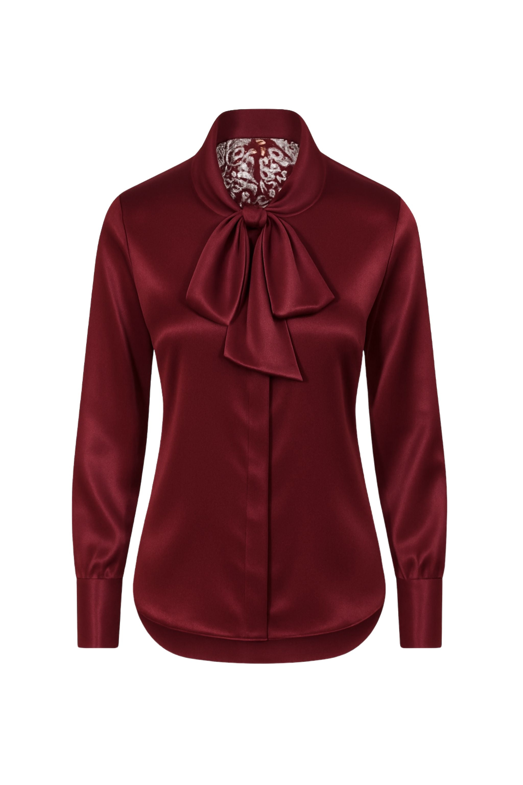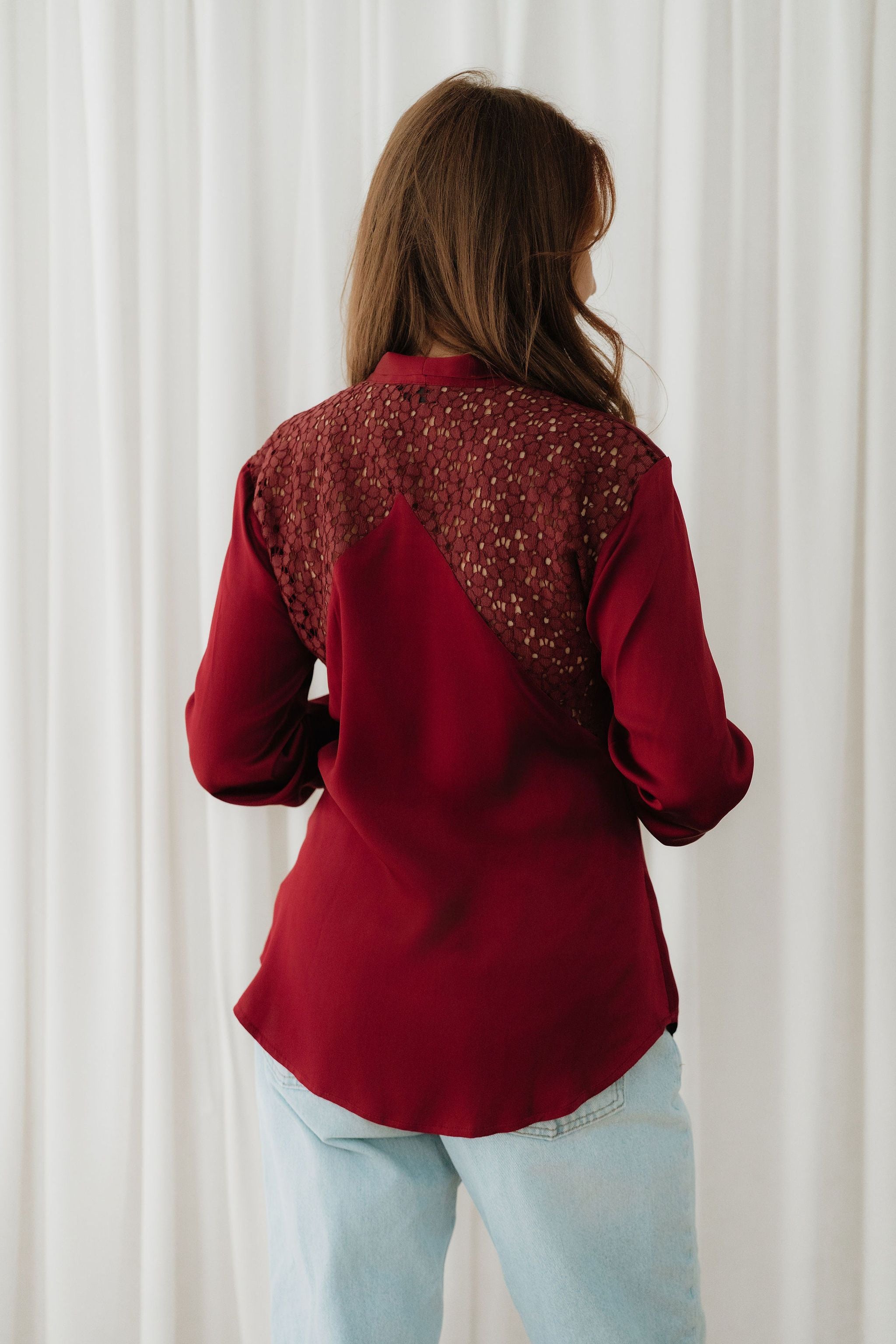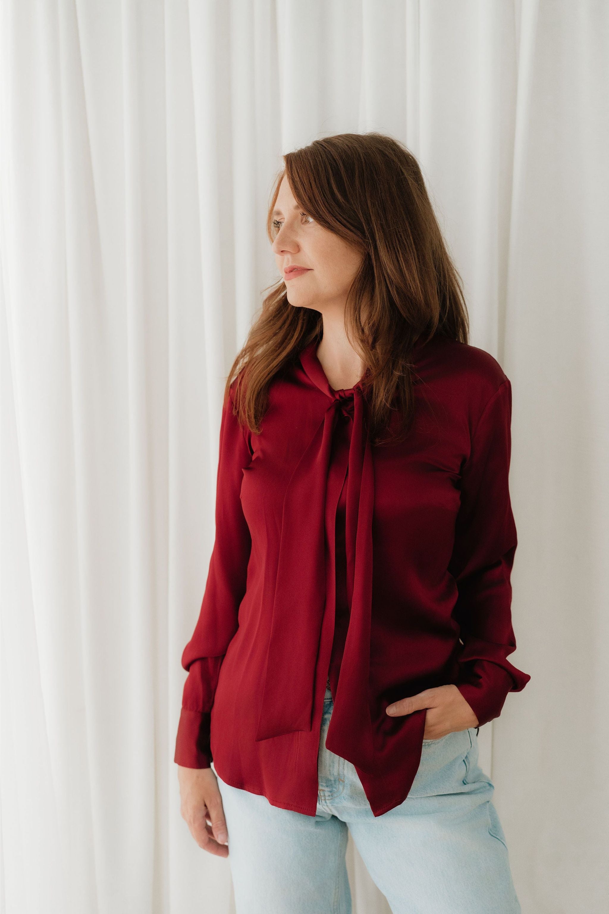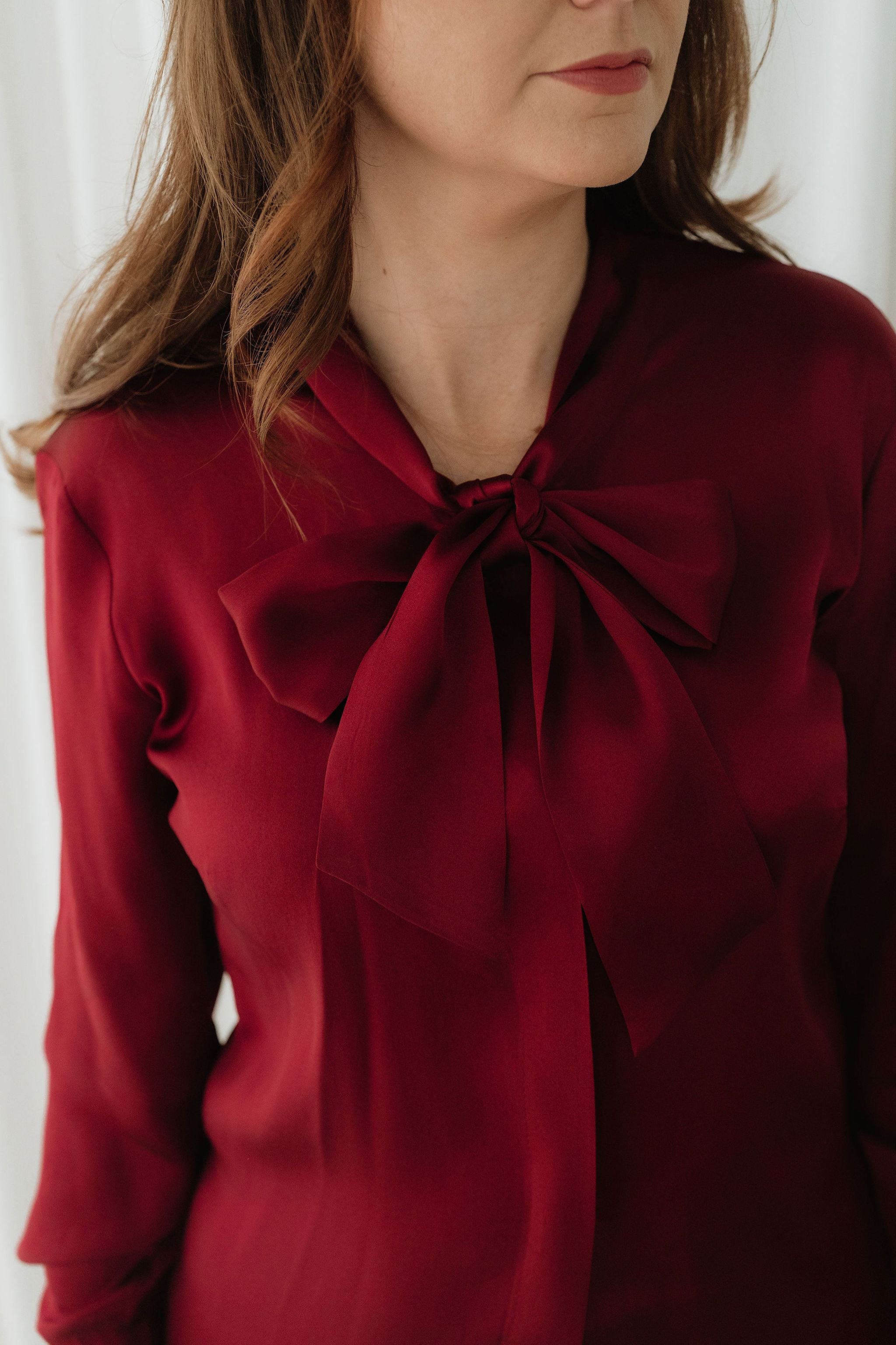 The definition of timeless femininity, Burgundy Red Silk Bow Blouse is a wardrobe staple designed to elevate both workwear and weekend looks. Cut from shimmering silk satin and detailed with beautiful floral lace, she brings together elegance and versatility in one effortless piece.