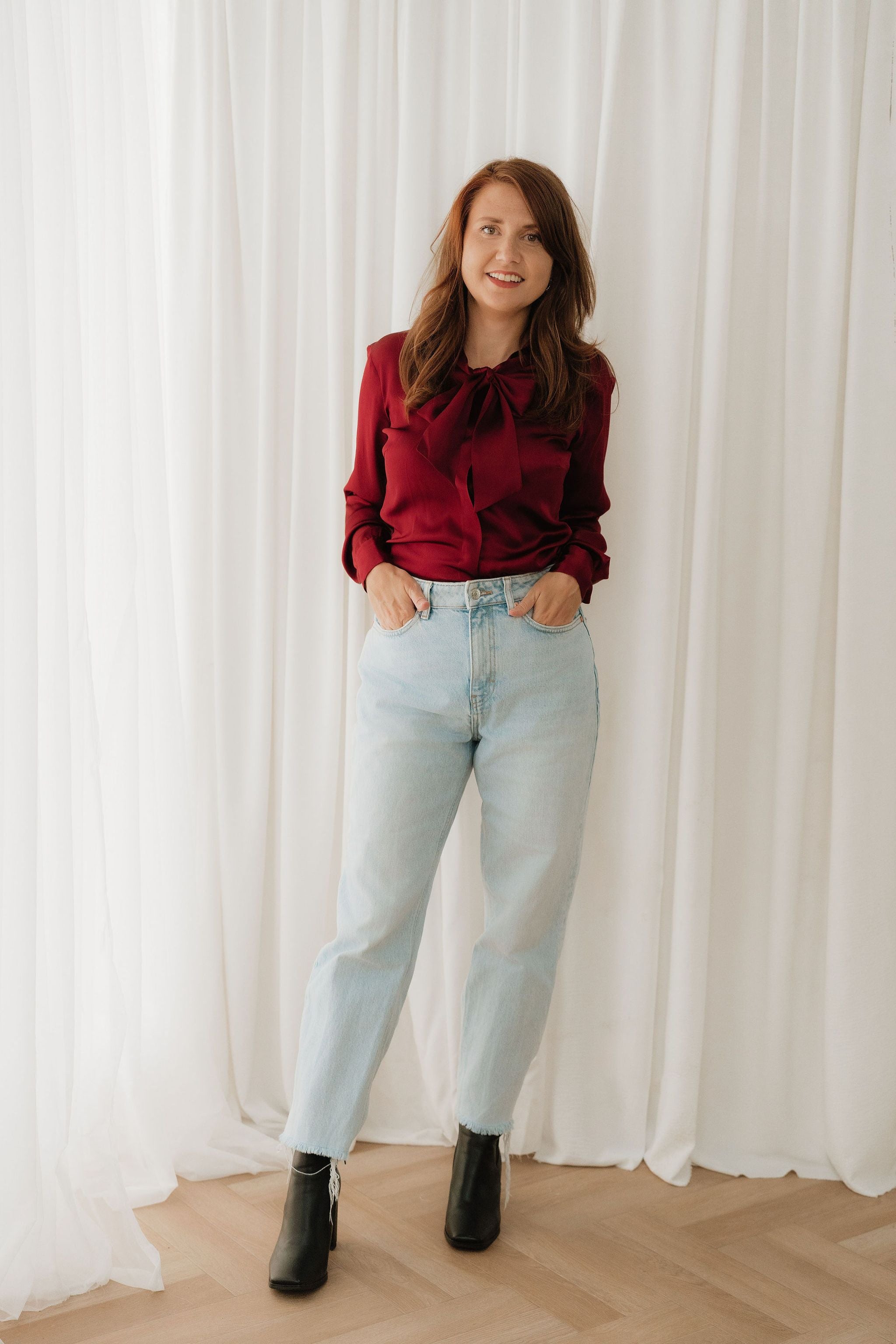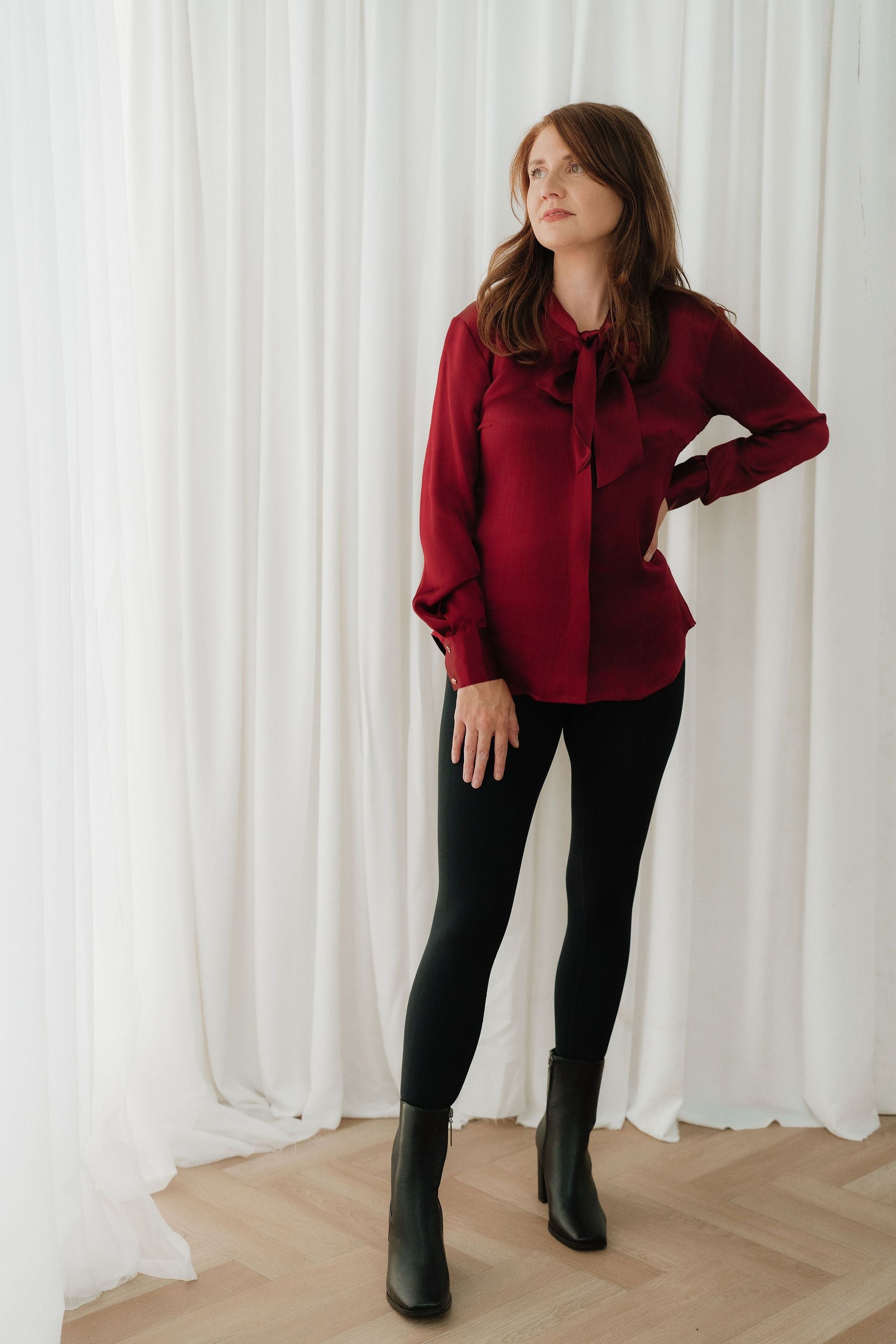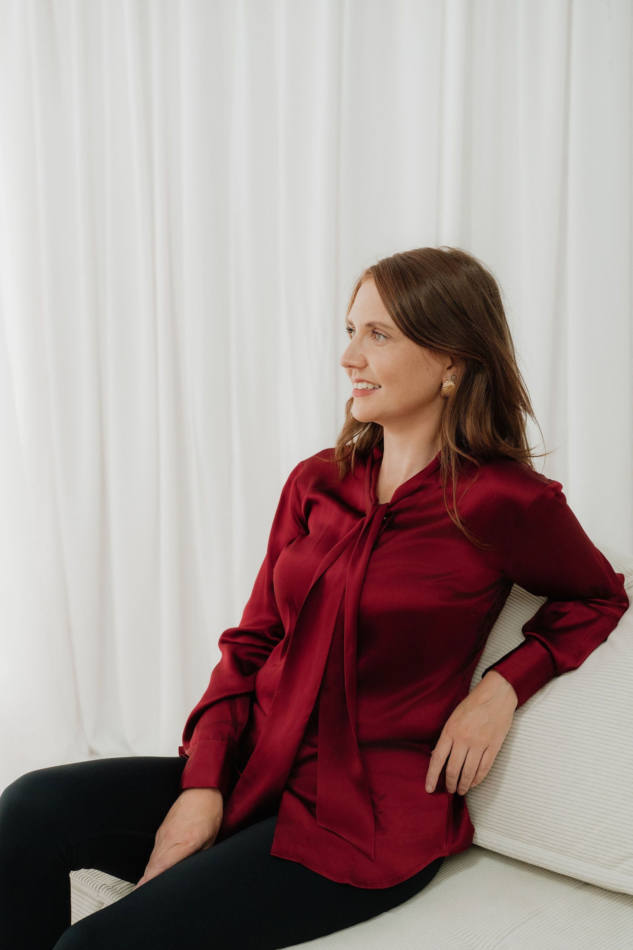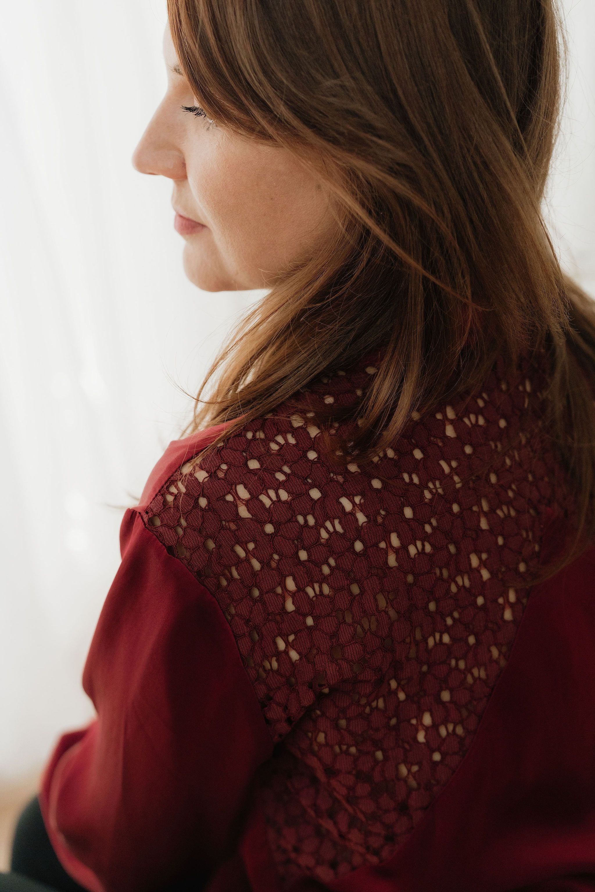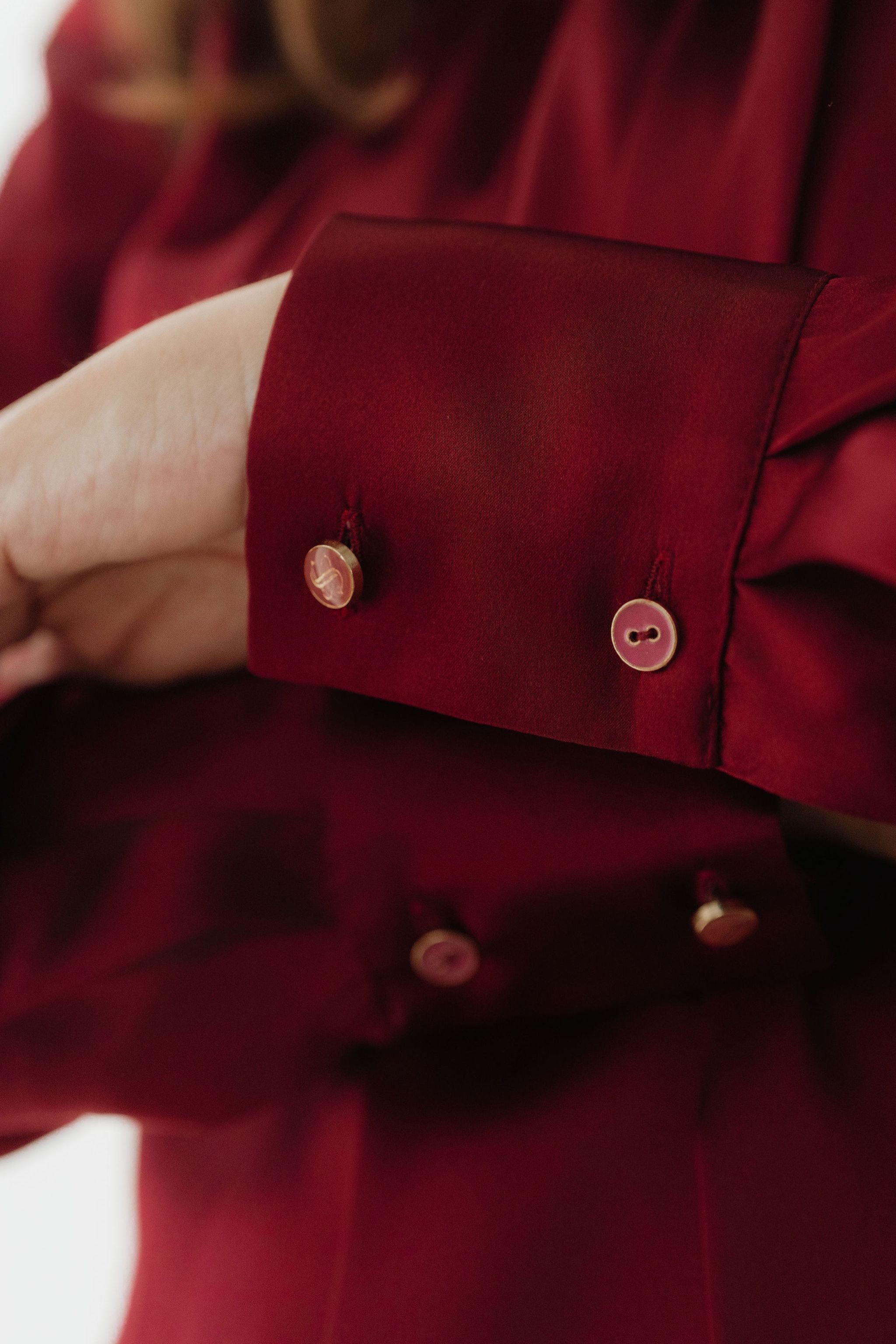 The definition of timeless femininity, Burgundy Red Silk Bow Blouse is a wardrobe staple designed to elevate both workwear and weekend looks. Cut from shimmering silk satin and detailed with beautiful floral lace, she brings together elegance and versatility in one effortless piece.