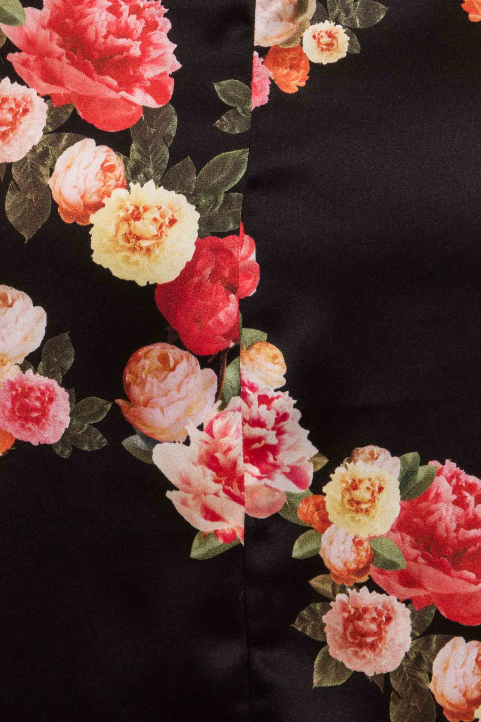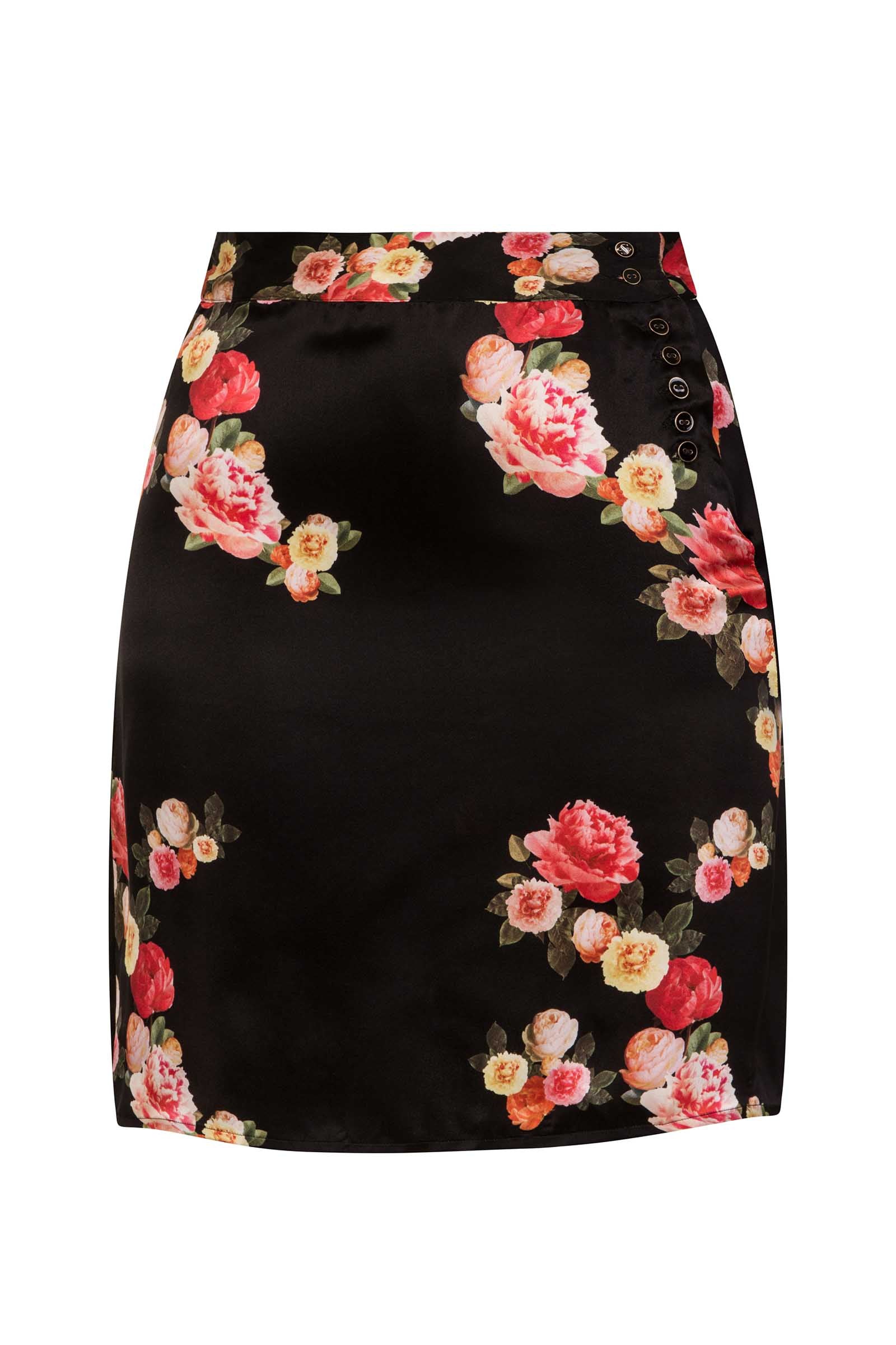 Meet MAE, this feminine silk mini skirt cut from a bespoke floral print silk satin, completes an array of looks. The Black Peony Silk Mini Skirt incorporates a delicate lace placement in the back vent. The warm floral print is made up of red, oranges and yellows on a jet black satin. This high-waisted silk skirt is tailored to perfection, fastening with custom-made, gold-edged buttons. Pair with the Silk Bow Blouse for a contemporary and elegant co-ord.