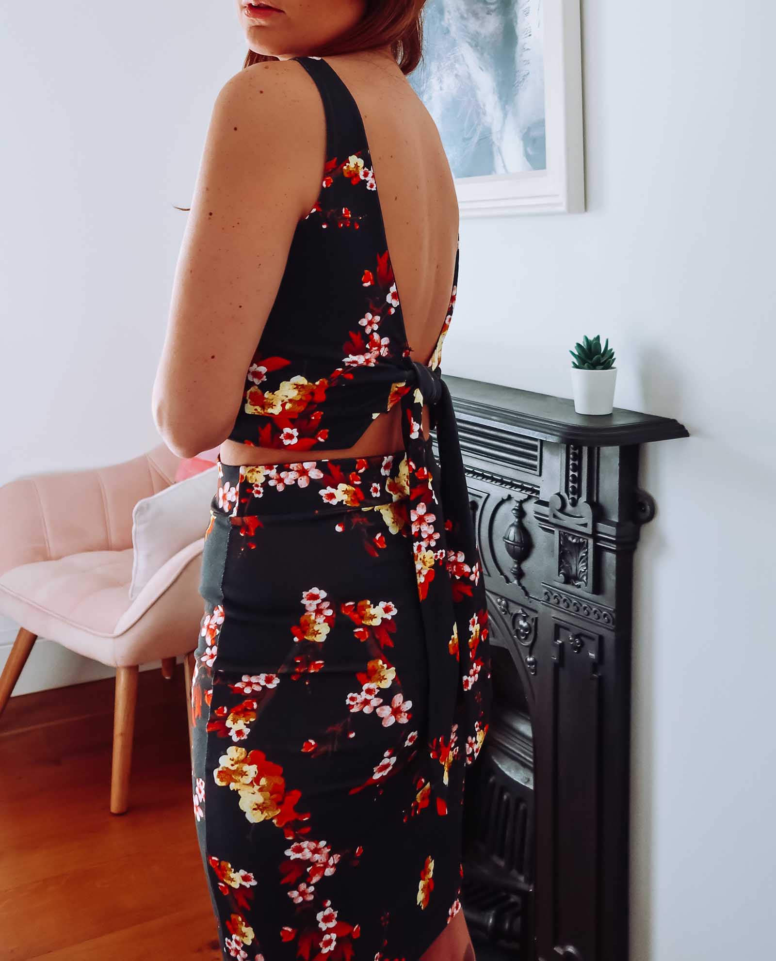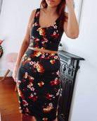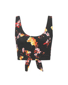 BELLA - The Black & Red Floral Crop Top is made from bespoke digital floral print jersey. Red and orange hues sit on a dark base. Fastened with a beautiful bow tie at the back for the ultimate versatility and elegant fit. The perfect co-ord with the Black & Red Jersey Skirt. A favourite to be worn underneath any signature shirt from the collection.