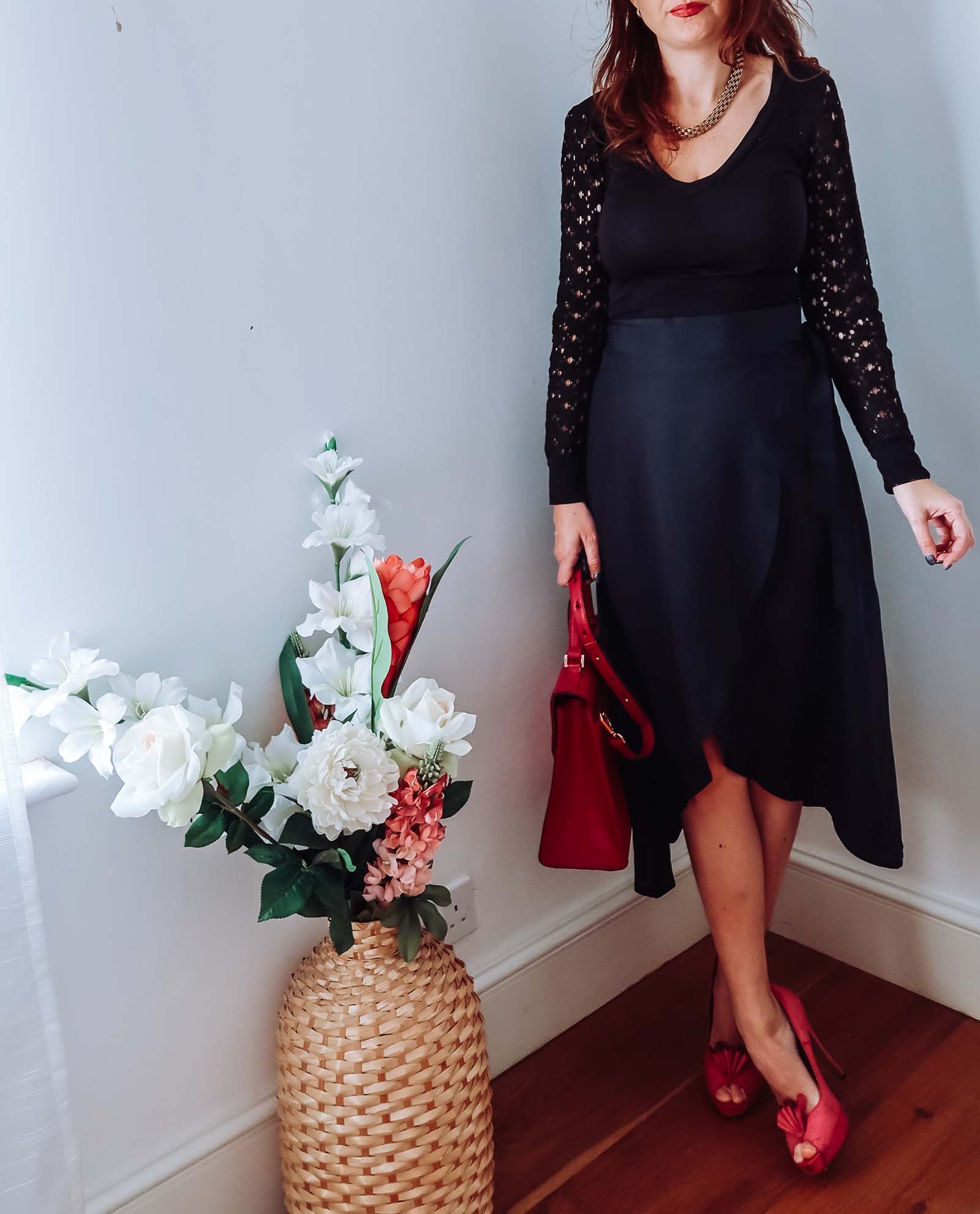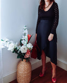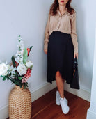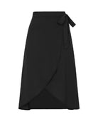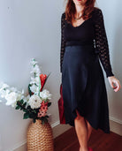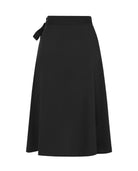 The Black Silk Wrap Skirt ties gently at the waist allowing for a versatile and adjustable fit. The skirt length falls just below the knee with a curved flowing hem. This elegant wrap skirt is cut from a lightweight silk crepe de chine. Dress up or dress down this skirt is the epitome of effortless elegance all day long.
