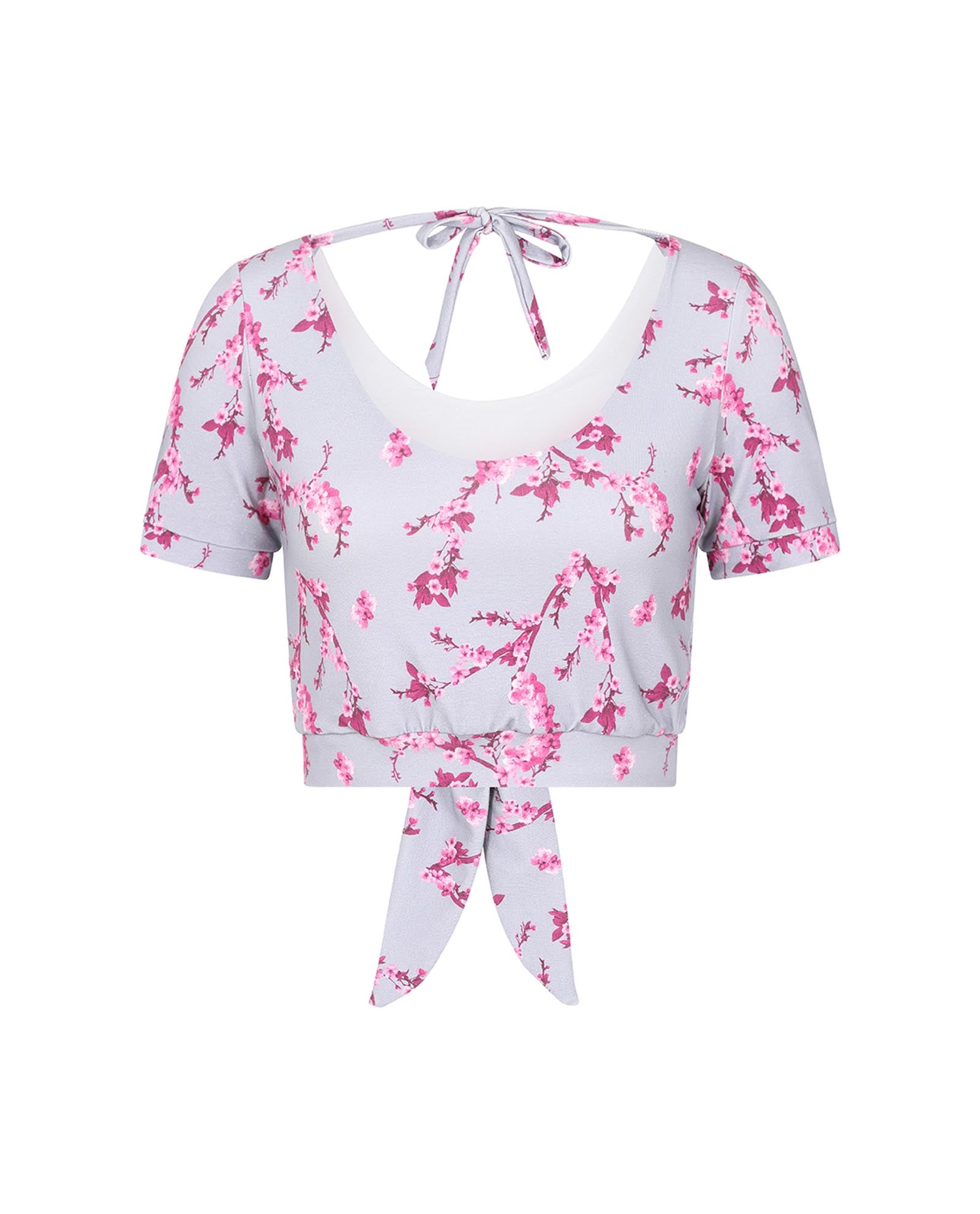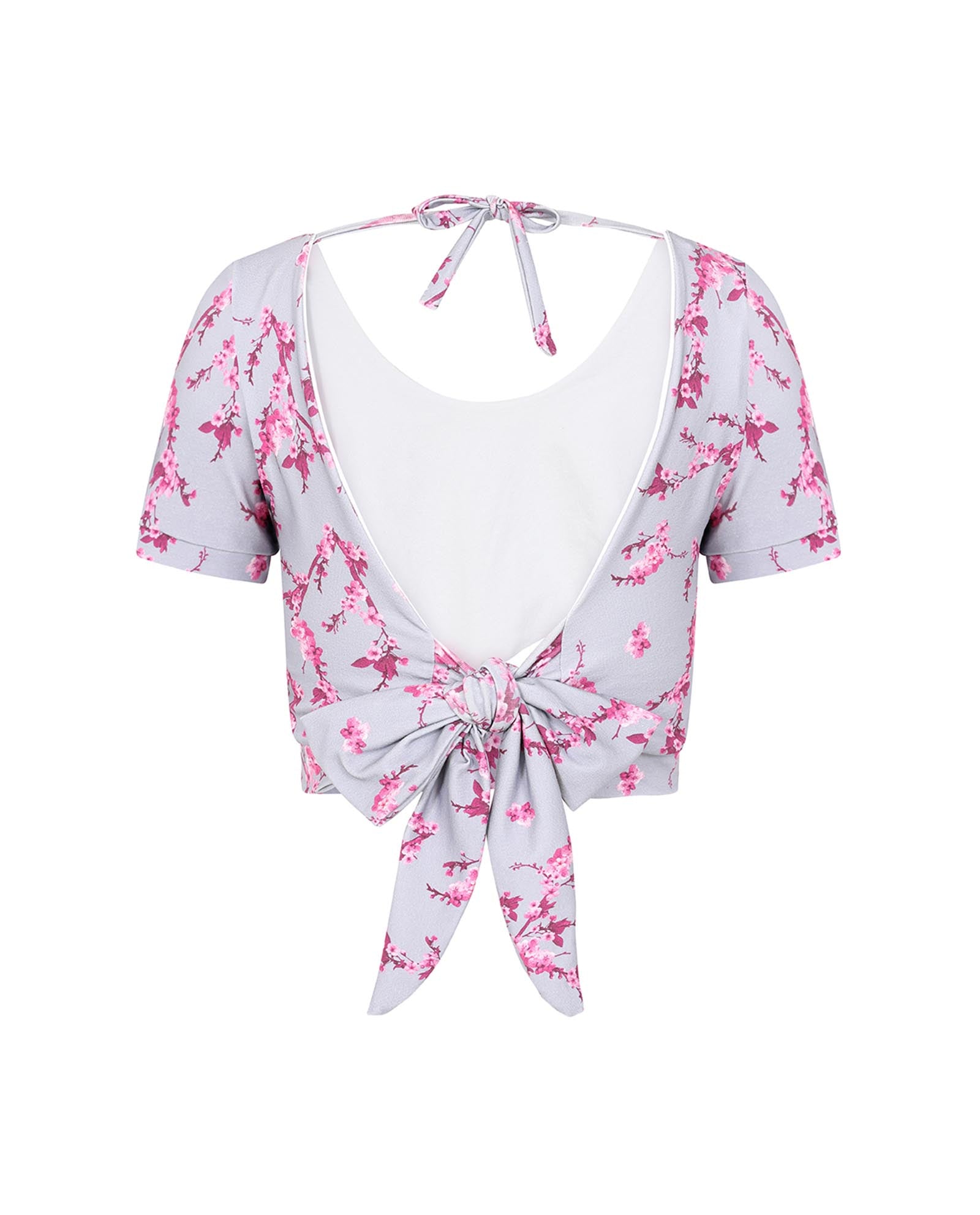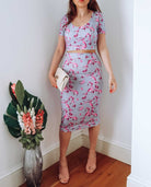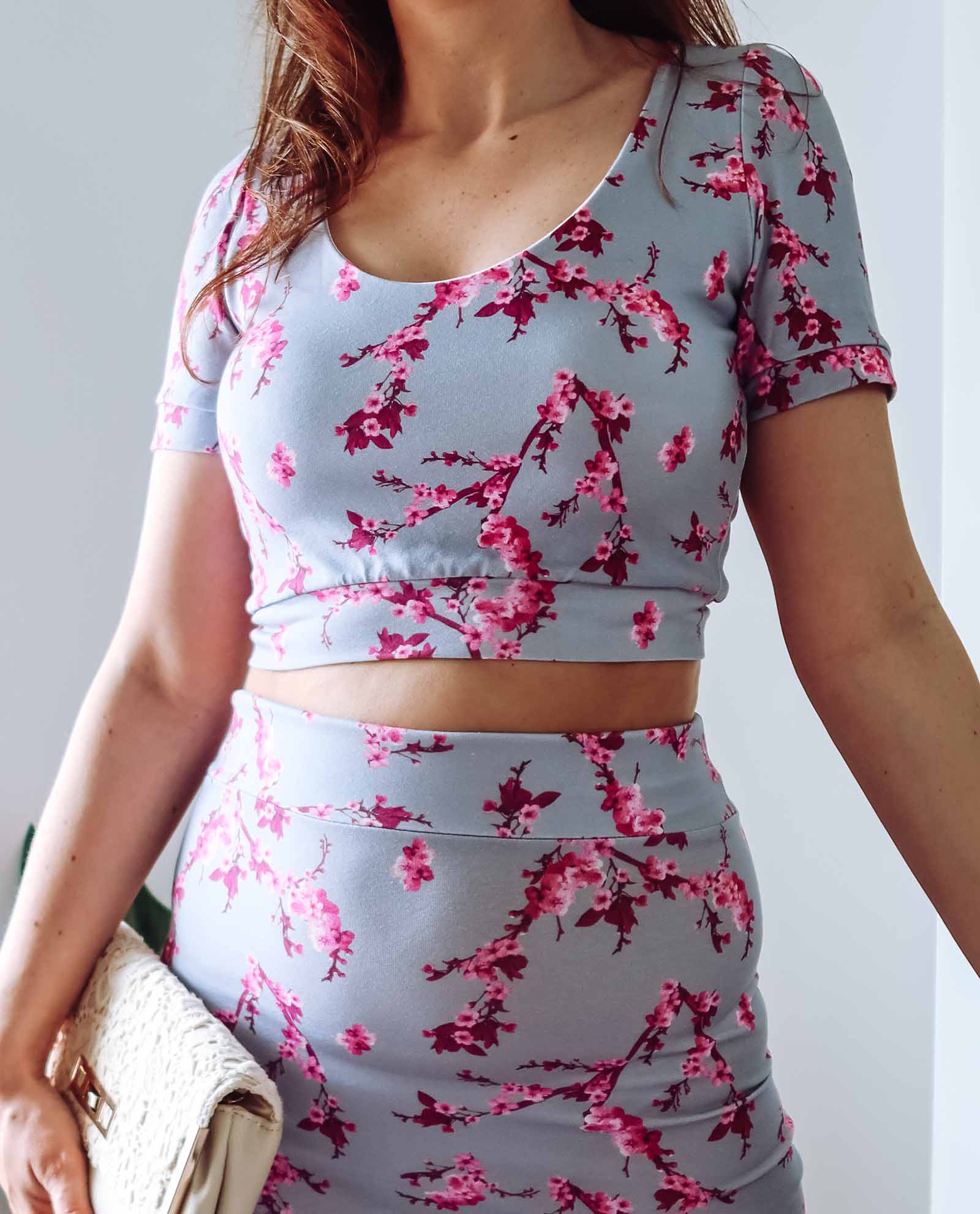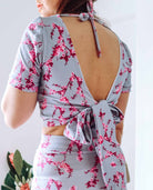 When the sun is shinning, the Grey & Pink Floral Crop Top is all you need to add a feminine spin to denim shorts. Featuring a bespoke digital cherry blossom floral print on a mid-weight cotton jersey, lined for comfort and extra support. It has long tie straps for the back fastening. These can be styled either with a knot or into a bow, whilst allowing for a versatile and adjustable fit. Pair with the Grey & Pink Midi Skirt for an elegant dress-ord.