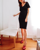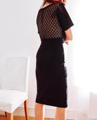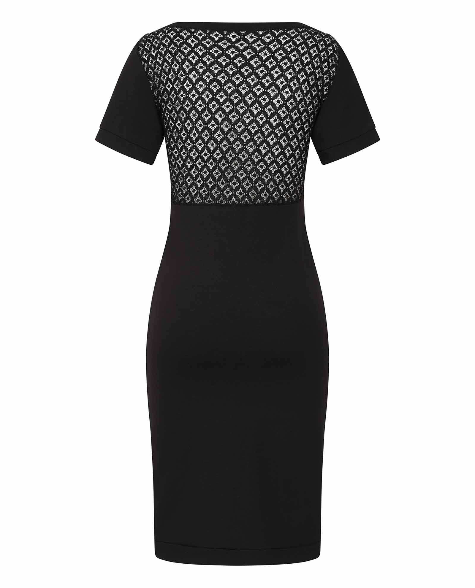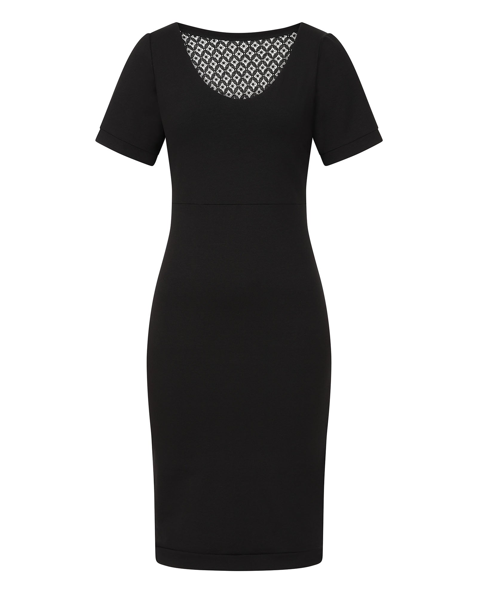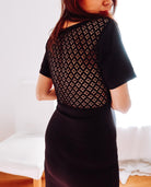 Introducing the ultimate day-to-night wardrobe staple: the SCD LBD. Our Black Lace Back Jersey Midi Dress is crafted from high-quality mid-weight cotton jersey and features a stunning geometric lace that's sure to turn heads. The dress is designed to flatter your curves with a feminine silhouette that hugs your body in all the right places. The double-lined bust provides added support for a comfortable fit. The midi dress boasts a tailored short sleeve and falls just above the knee, making it the perfect length for any occasion.