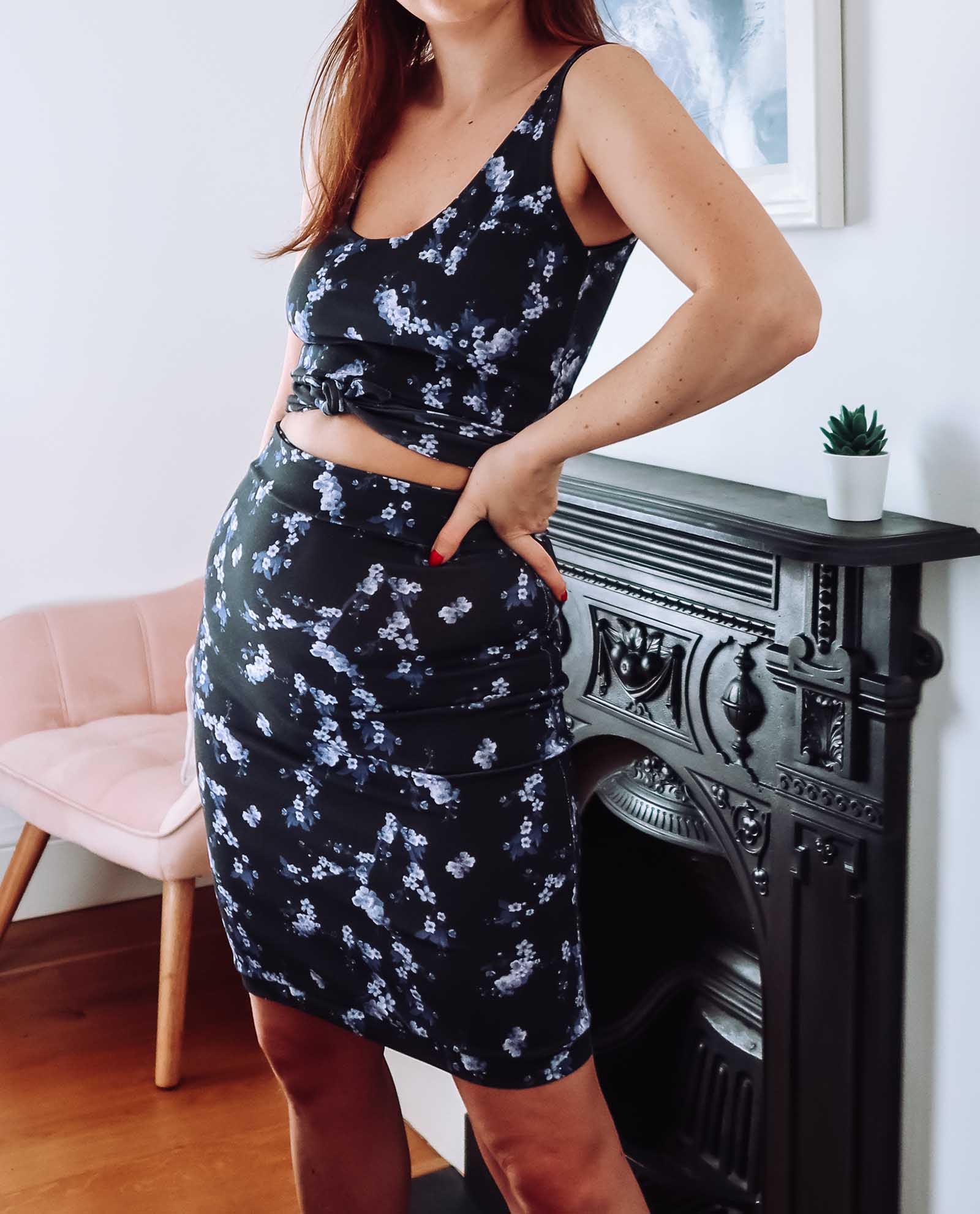 The Black & Grey Floral Jersey Skirt pairs beautifully with our SCD tops and silk shirts. The feminine fitted design is cut from a bespoke floral print on dark cotton jersey. Tailored to perfection this is a body sculpting fit with a wide waistband. The length is versatile; either worn as a high waisted mini skirt or placed lower on the hip falling just above the knee depending on styling preference.