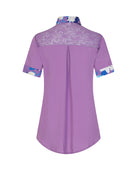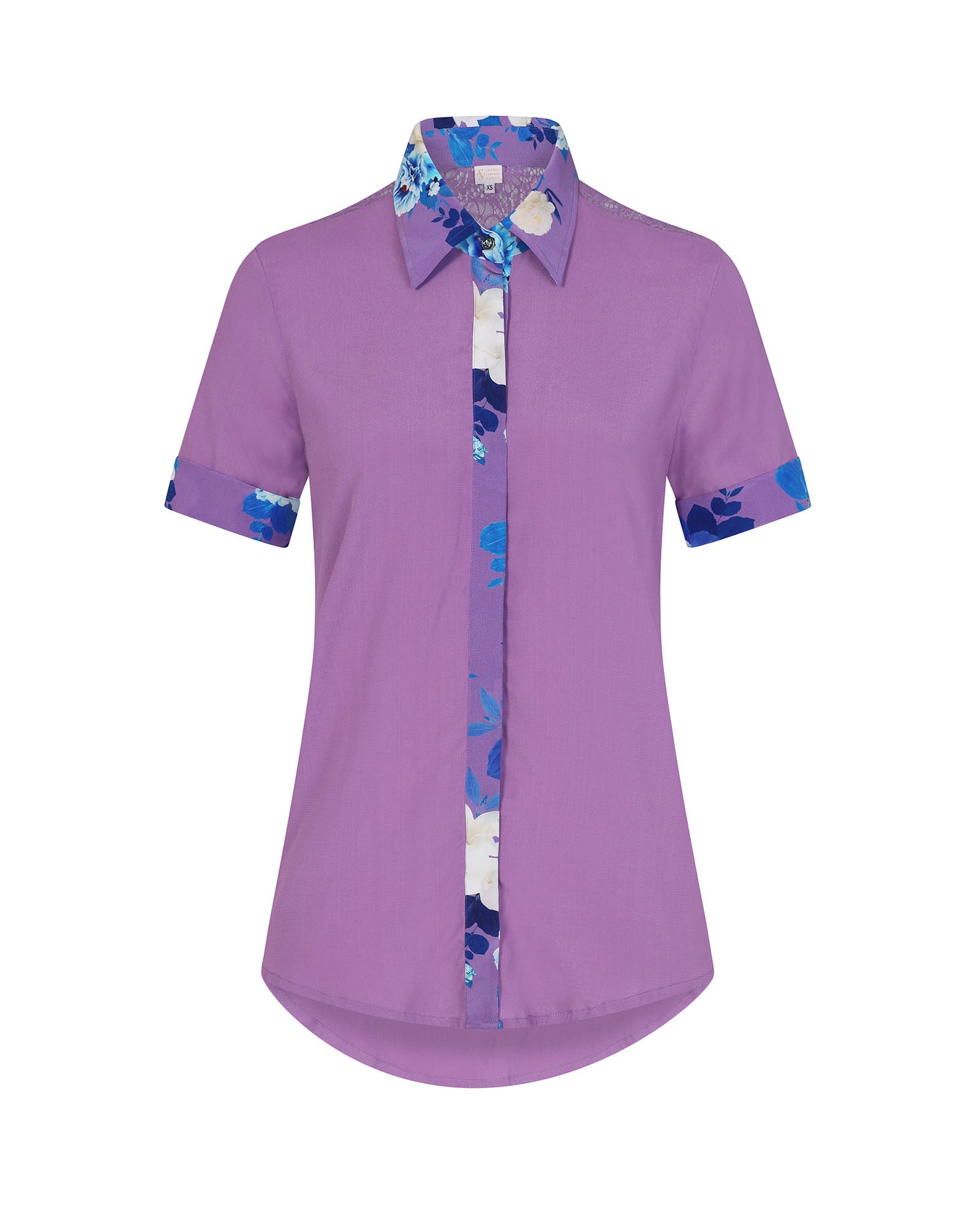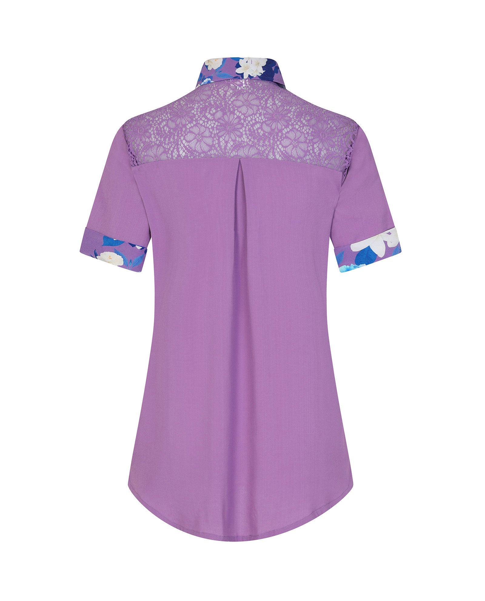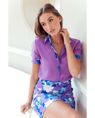 Purple Peony Classic Shirt - meet our signature style Maggie, featuring a bespoke floral peony print. The Maggie shirt offers a loose fit, the Italian lace panel adds a delicate and feminine detail, while the back pleat gives the shirt a subtle volume. A bespoke floral silk print in violet and blue hues adds luxurious detailing to the silk button plackets and tailored sleeves, beautifully outlining this summer silk shirt style.