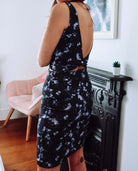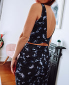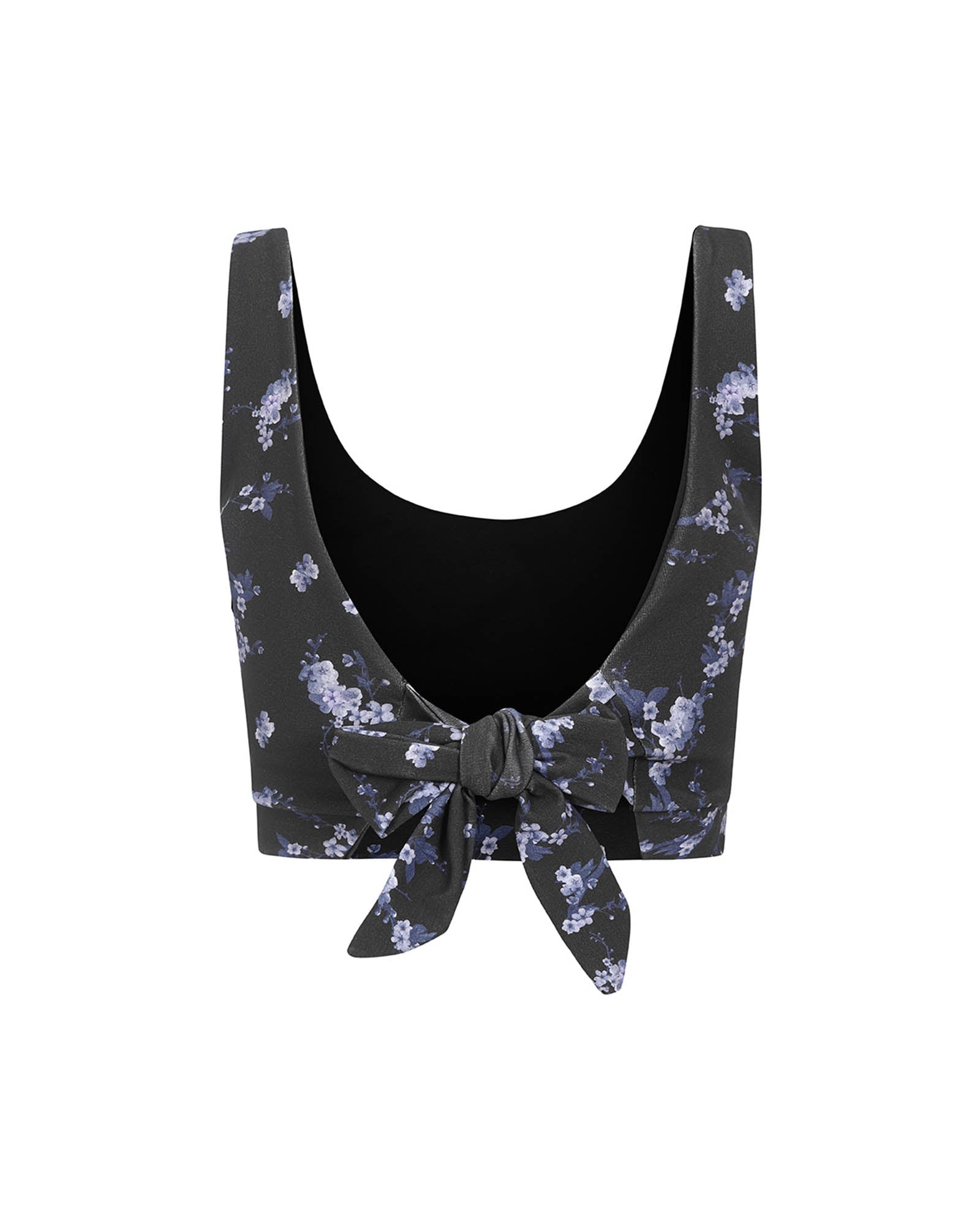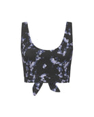 BELLA - The Black & Grey Floral Crop Top is made from bespoke digital floral print jersey. Blue and grey hues sit on a dark base. Fastened with a beautiful bow tie at the back for the ultimate versatility and elegant fit. The perfect co-ord with the Black & Grey Jersey Skirt. A favourite to be worn underneath any signature shirt from the collection.